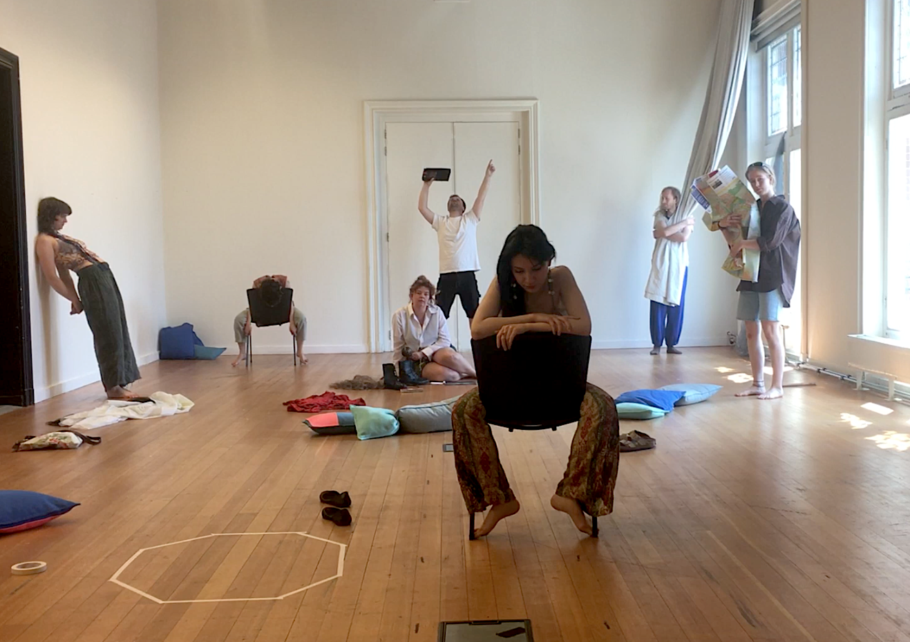 The setup was to search for what moves every student to create a live piece in front of an audience? What needs to be seen? Where do you place your audience and what do you want to tell your audience? We worked as a group with the body, materials and objects. How can you relate to an object, how can an object have several meanings and how can we create an interesting image for the viewer? We made lists of instructions for each other to experiment in a creative way with these materials and objects. At the end of the semester every student developed a solo performance.